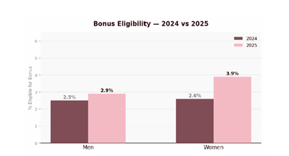 As in 2024, no company-wide profit share payment was made during the 12-month period to the snapshot date. When profit share is paid, all eligible partners receive the same amount regardless of salary. Differences in profit share amounts arise only where partners work part time and receive a pro-rated payment, a demographic in which women are more highly represented.