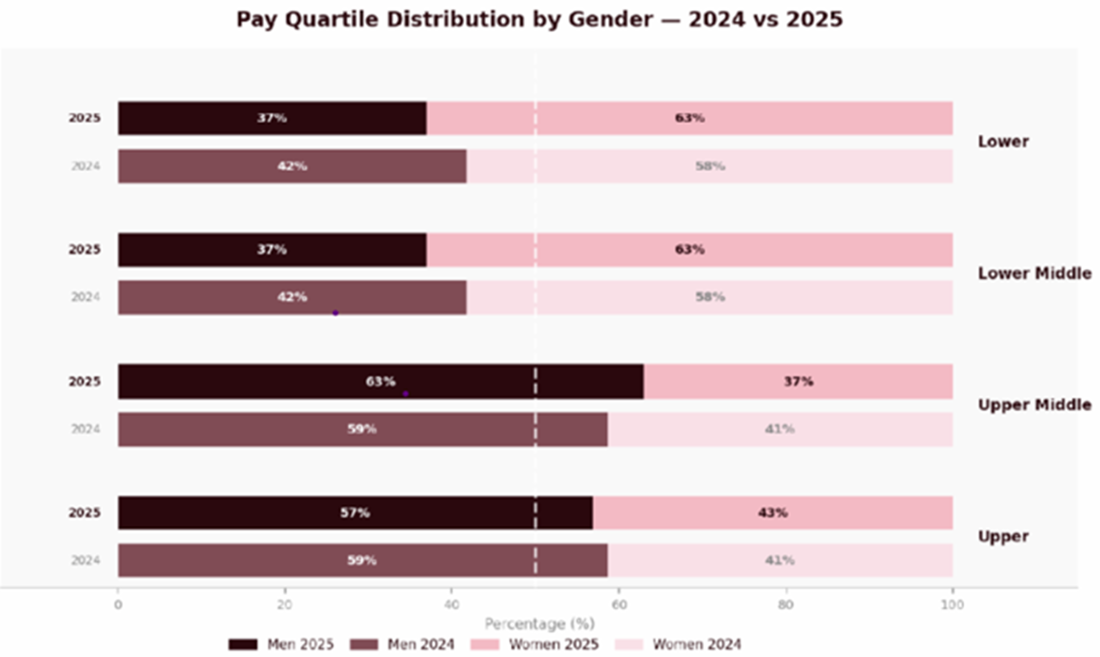 We have seen an increase in the percentage of women in the lower two quartiles from 58.2% in 2024 to 63% in 2025, contributing to the increase in the median gap. It is encouraging, however, that we have the highest percentage of women in the upper quartile since reporting began, at 43.2%, and that this quartile shows a pay gap in favour of women at –4.4%.